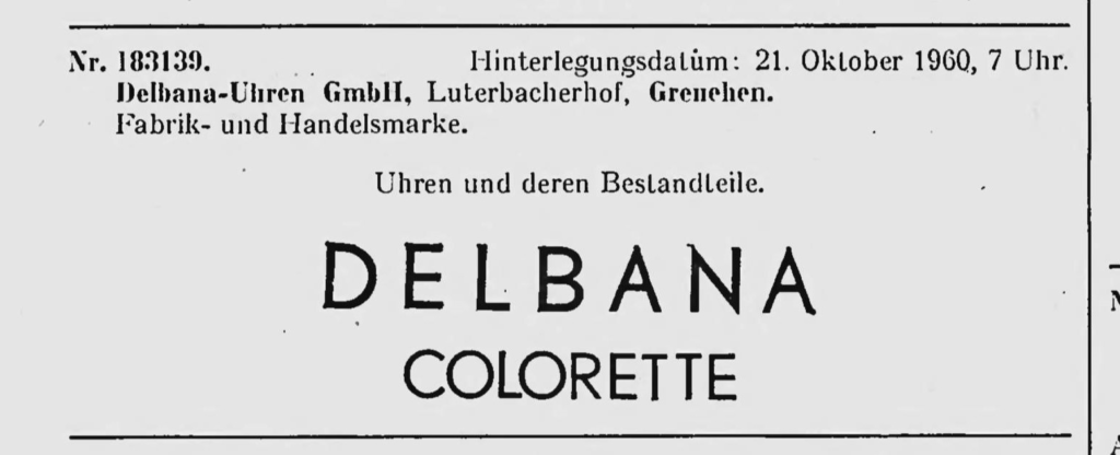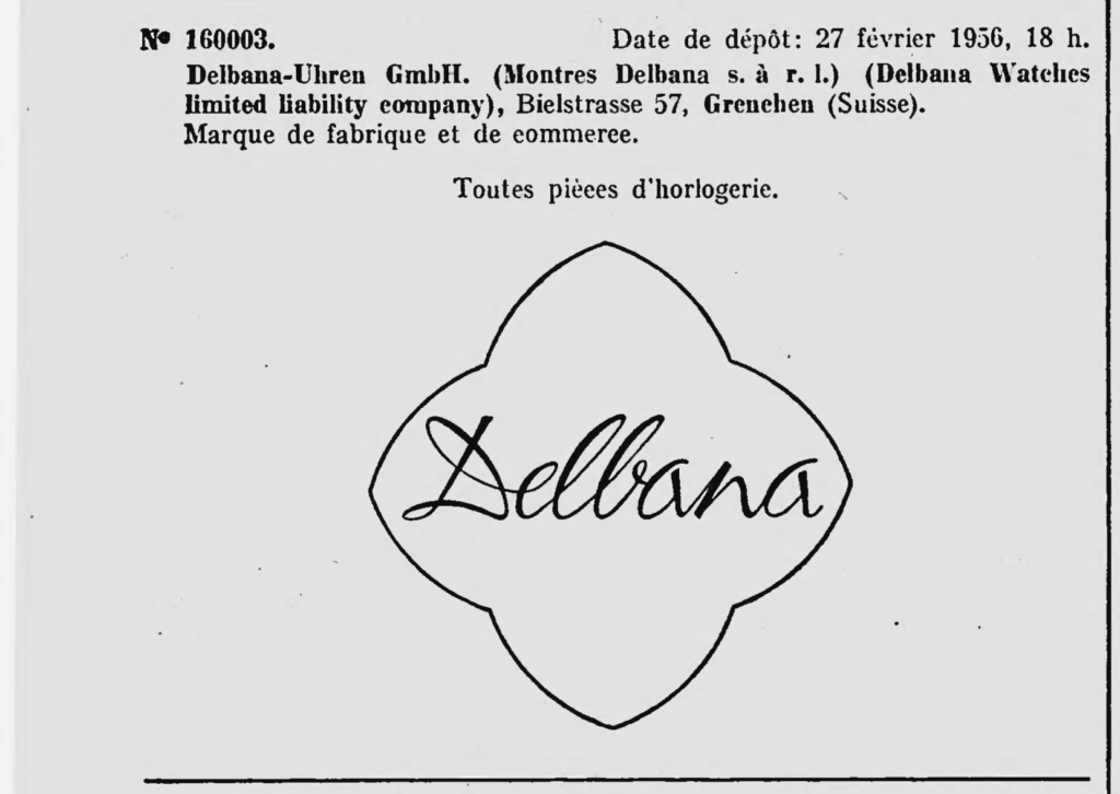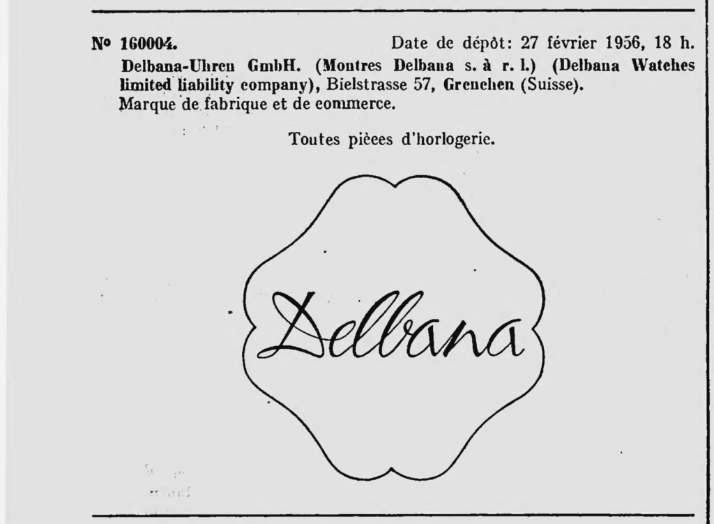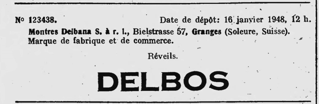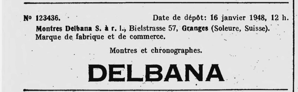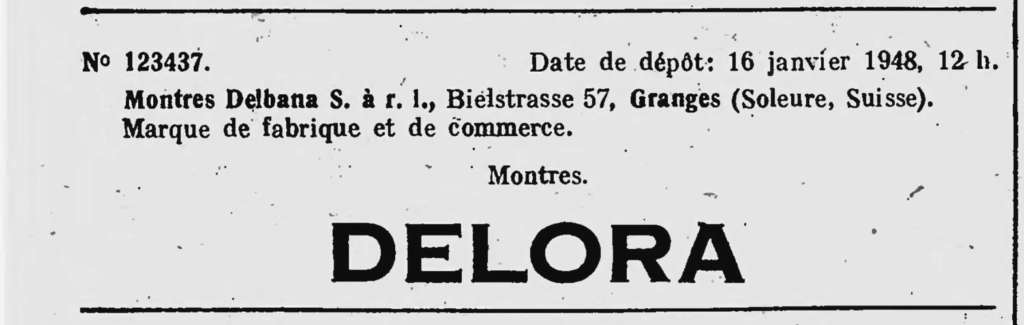 Z dniem 16 stycznia 1948 roku firma Montres Delbana S. A. R. L. rejestruje trzy znaki towarowe: Zegarki i chronografy. DELBANA, Zegarki DELORA oraz budziki DELBOS.