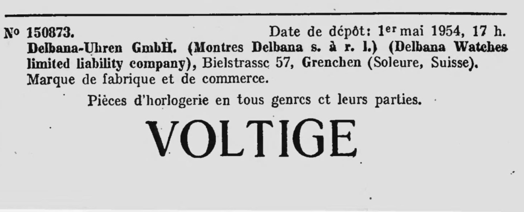 1 maja 1954 roku firma Delbana rejestruje znak towarowy: Wyroby zegarmistrzowskie wszystkich typów i ich części VOLTIGE.