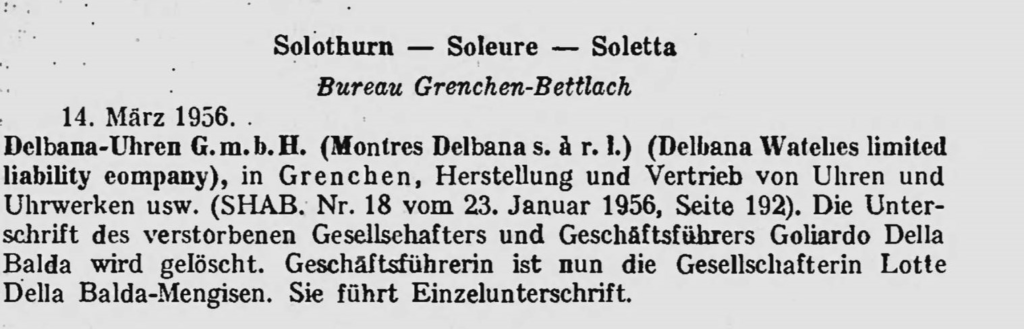 „30 grudnia 1944. Goilardo Della Balda, fabrykacja d’horlogerie Delba, w Grenchen (SHAB. nr 66 z 20 marca 1943, s. 635). W związku z zaprzestaniem prowadzenia działalności firma zostanie rozwiązana. Aktywami i pasywami zarządza spółka « Delbana-Uhren G.m.b.H. », w Grenchen, przejęty.”
