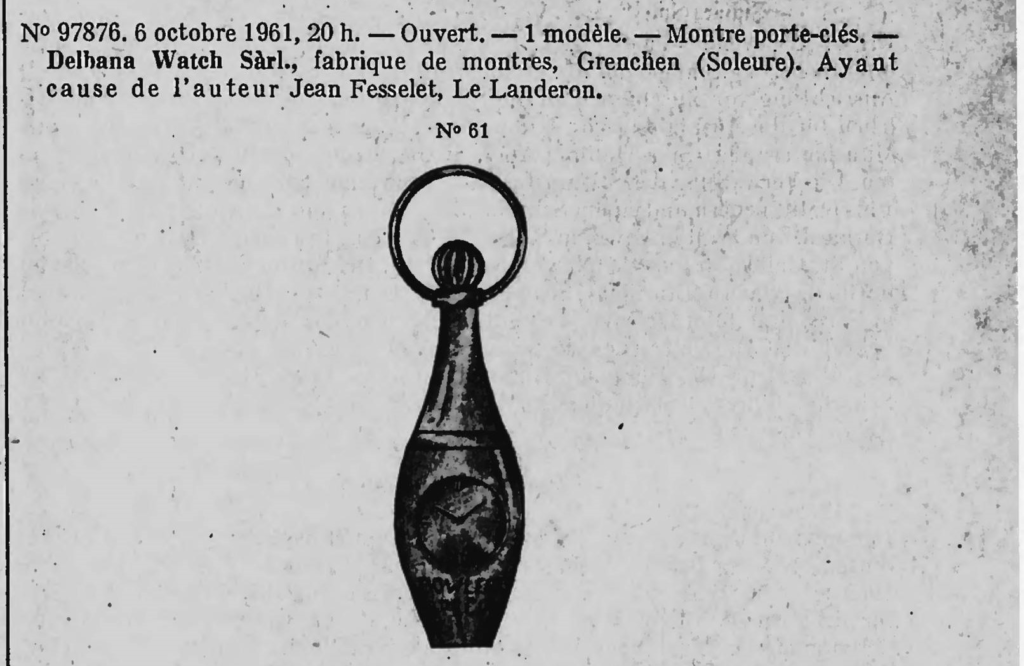 6 pazdziernika 1961 rejestracja „Zegarek na breloczku. — Delbana Watch Sàrl., producent zegarków, Grenchen (Solura). W imieniu autora Jeana Fesselet, Le Landeron.”