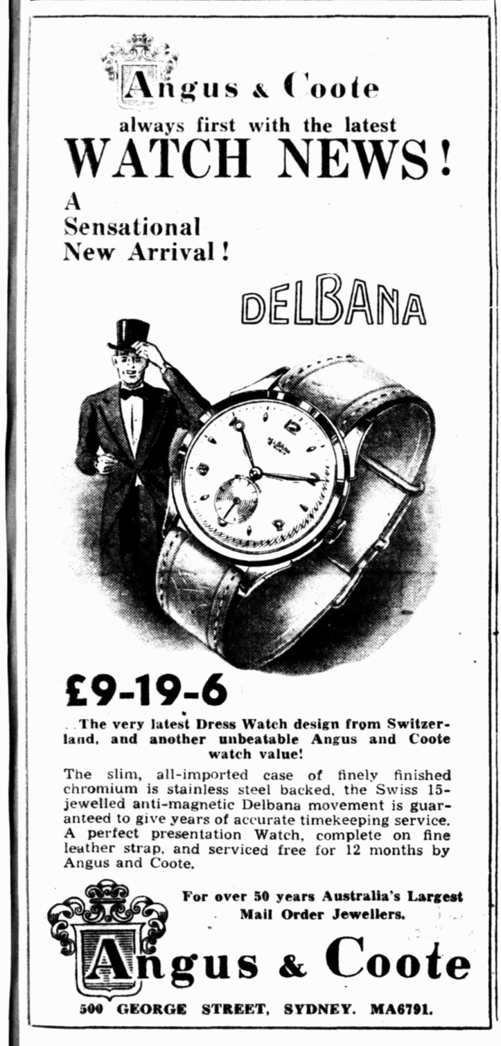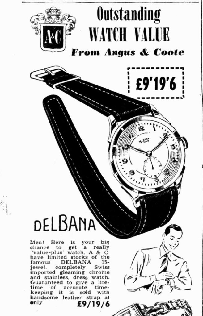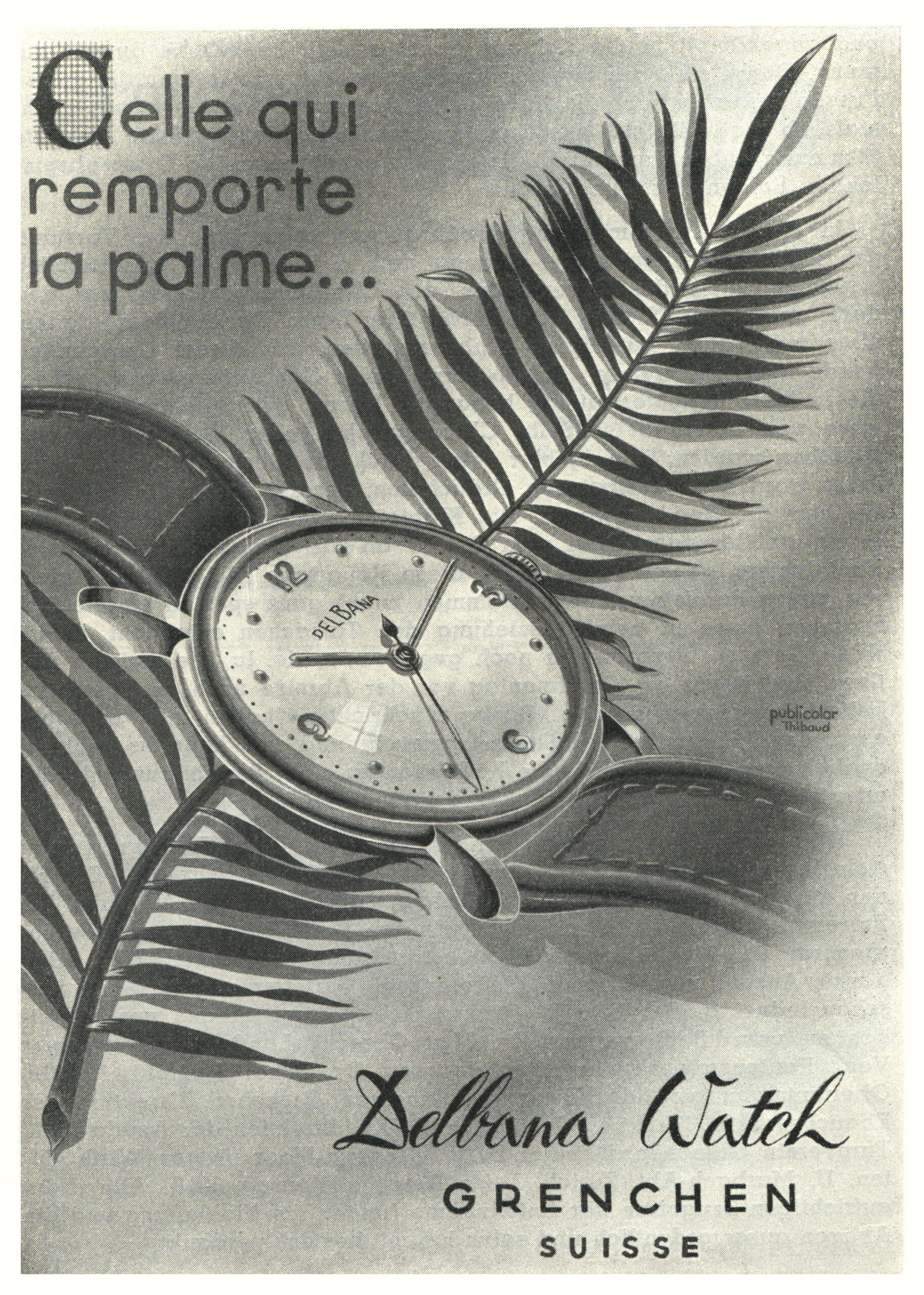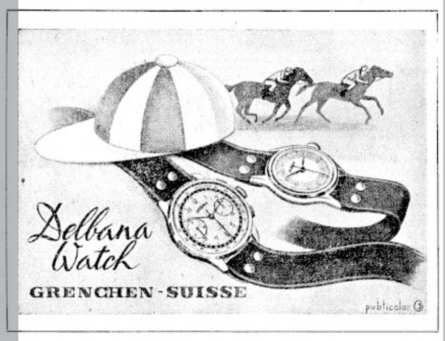 Oryginalna całostronicowa reklama szwajcarskiego magazynu z roku 1954 dla Delbana Watch Company, Grenchen, Suisse