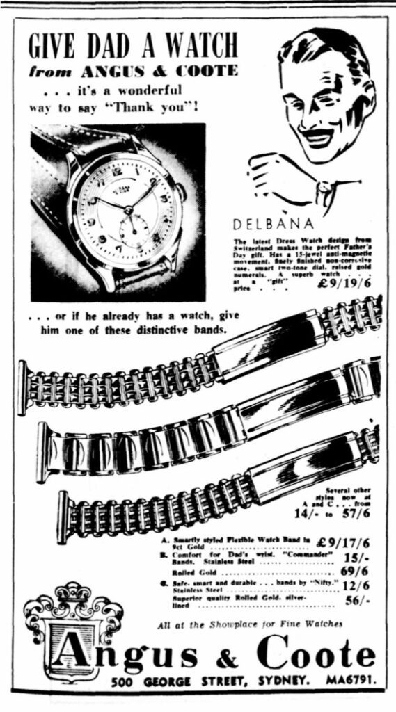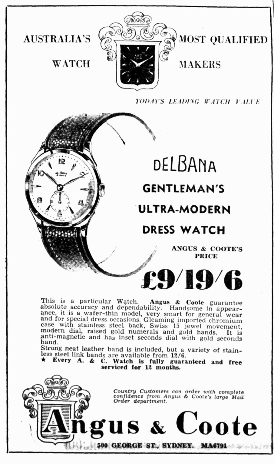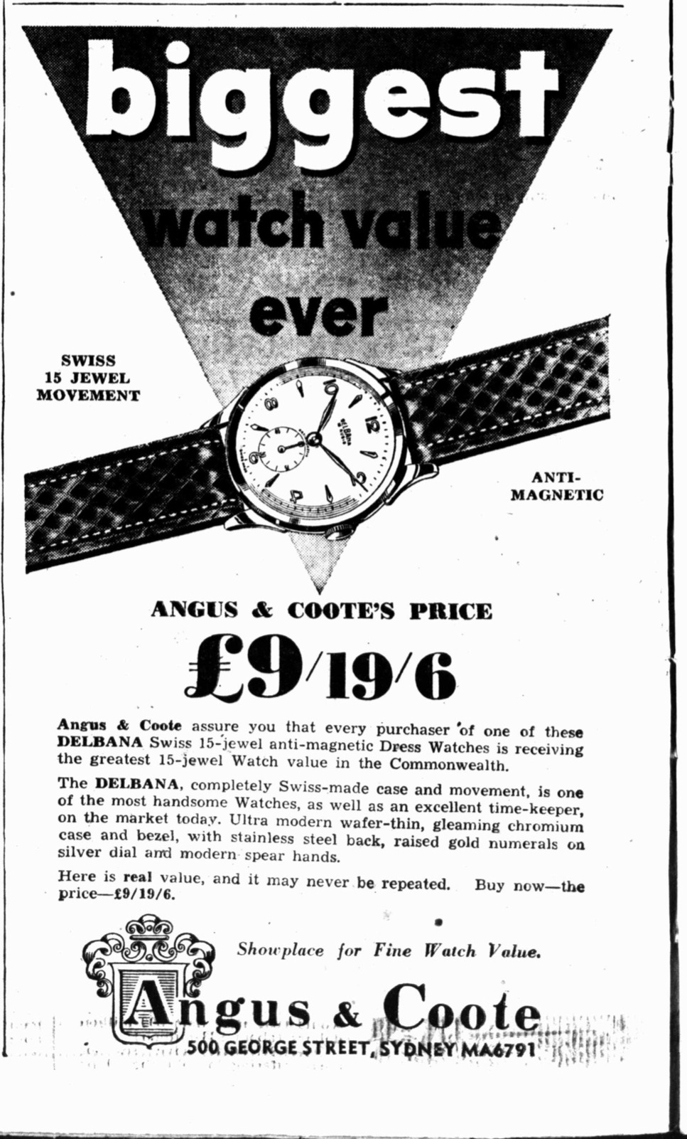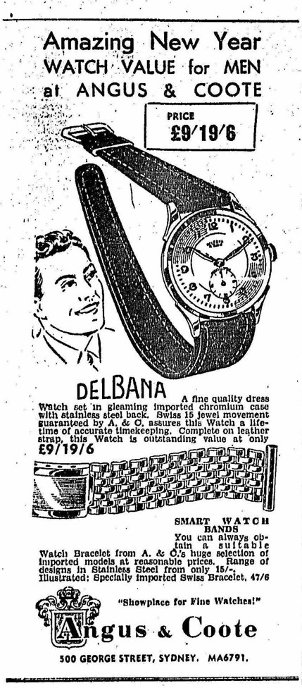 Oryginalna całostronicowa reklama szwajcarskiego magazynu z roku 1954 dla Delbana Watch Company, Grenchen, Suisse